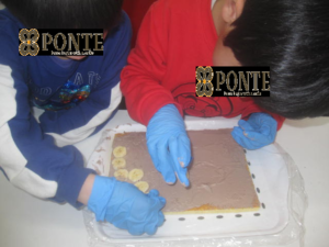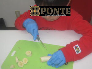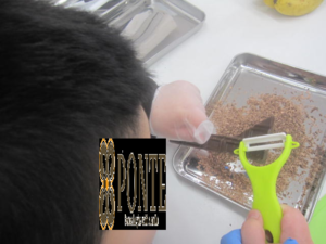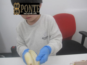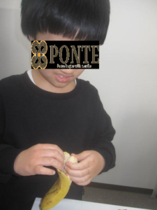 バナナむき係、切る係、チョコレート削り係、生クリーム塗り係、