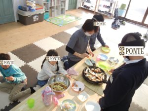 パン耳ラスク@キッズぽんて 今日のキッズぽんては調理レクリエーション 『パン耳ラスク』です ホットプレートで作れるので結構簡単で美味しい!! 平野レミさんではないですが簡単で美味しいって最高ですネ 今日はお誕生会も兼ねていて みんなでお誕生日の歌でお祝いしました キッズぽんてにきて一年なり ひとつお姉さんになったので お片付けも率先してやります!! 成長を感じる一日でした