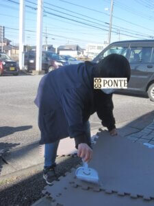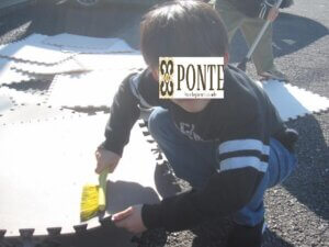 別のグループではきっず前の駐車場で剝がしたマットの汚れを綺麗に落とします。